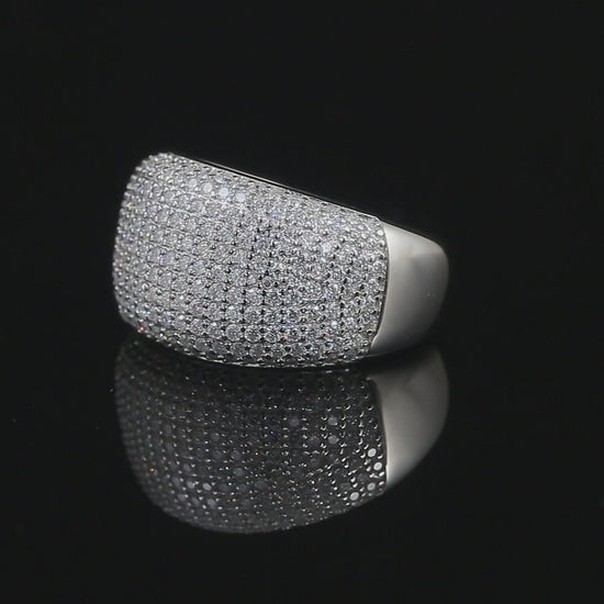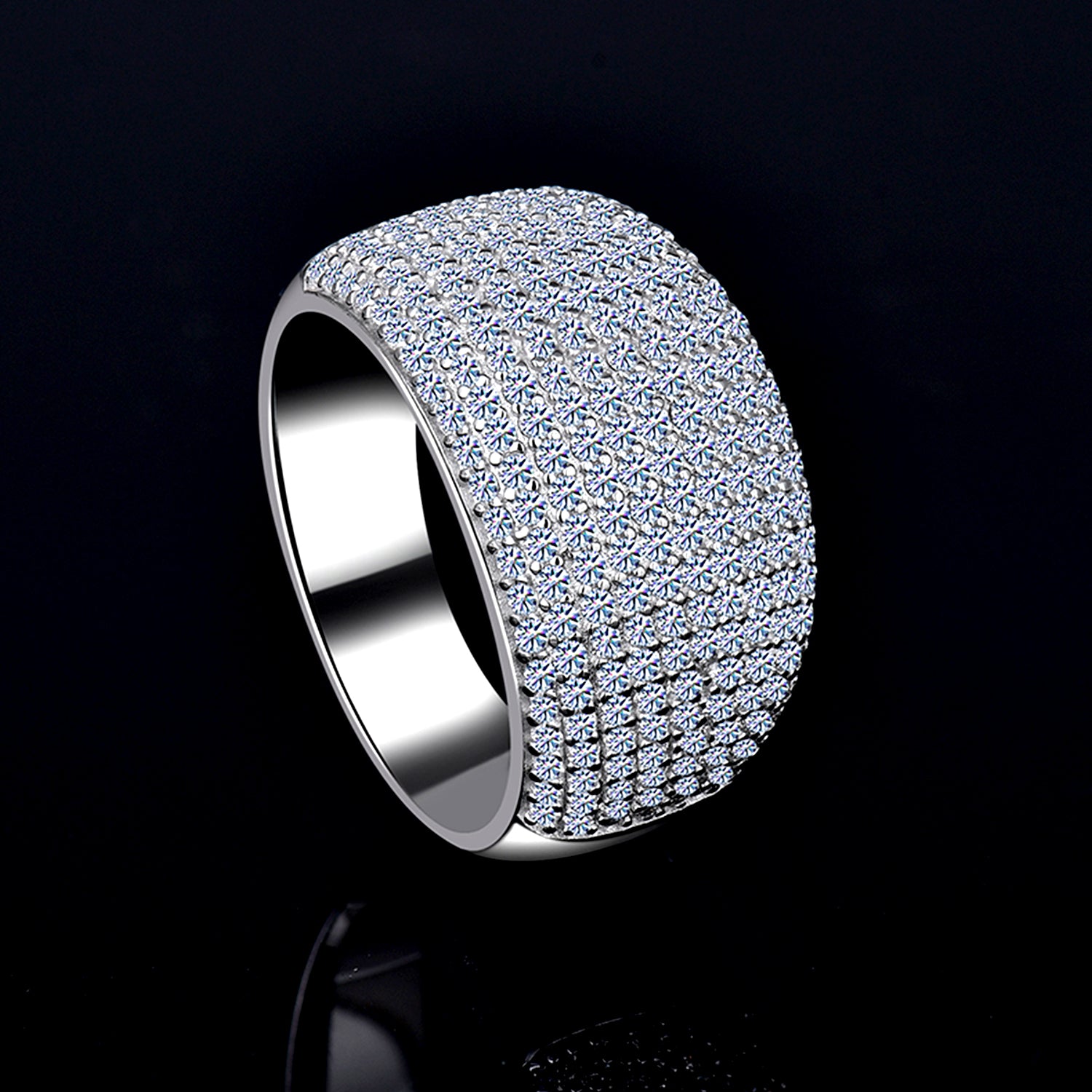The seamless pave design creates a bold yet elegant presence, making it the perfect choice for weddings, anniversaries, or statement wear. Crafted from 10.58 grams of solid 925 sterling silver, this band combines durability with a sleek, polished finish that enhances its brilliance.