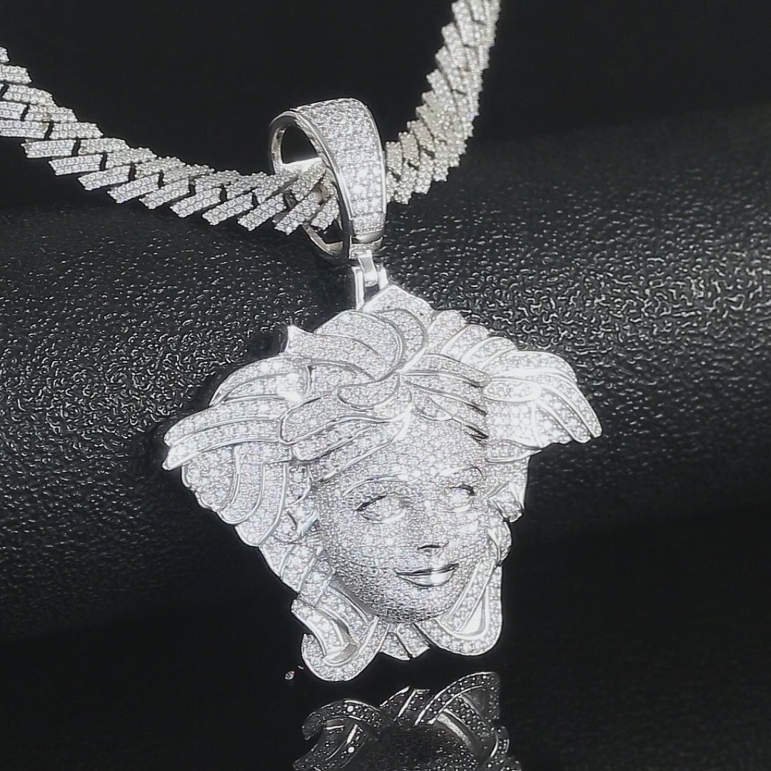 Every detail of this Medusa pendant is precision set — from the radiant facial contours to the flowing iced-out hair — creating a captivating shine from every angle. Designed for those who move with confidence, this piece reflects the same craftsmanship and street-luxury aesthetic seen in the most sought-after moissanite jewelry collections.