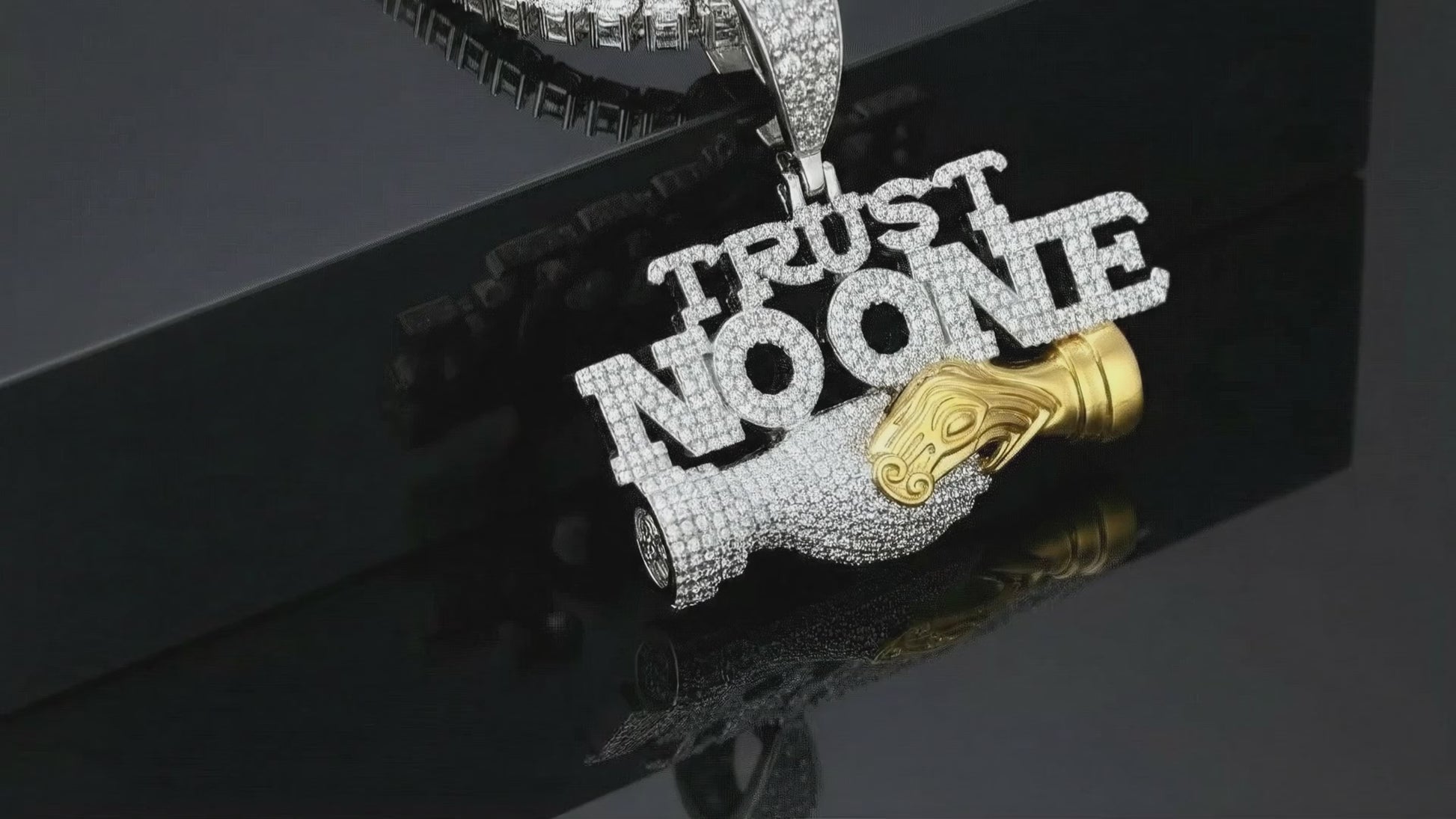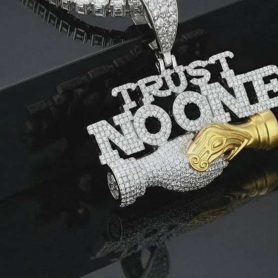 The bold “Trust No One” design, paired with an iced-out praying hands motif, symbolizes strength, self-belief, and resilience — making it more than just jewelry; it’s a statement of mindset and energy.