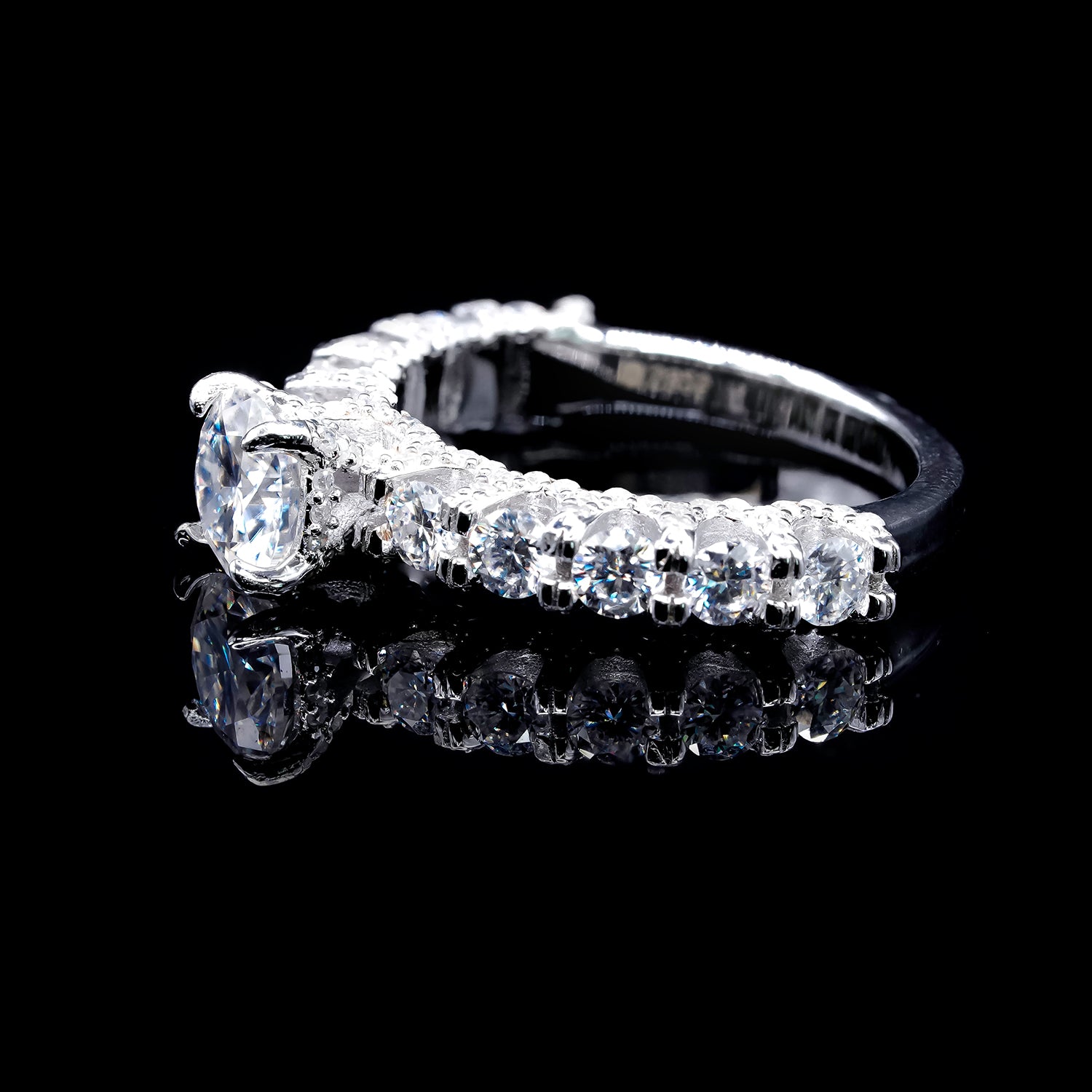Set with a brilliant 2.50 carat round-cut VVSD moissanite at its center, this ring is surrounded by a pavé of shimmering stones that enhance its fire and brilliance from every angle. Made with real 925 sterling silver (5.00g), it offers both durability and elegance for everyday wear or special occasions.