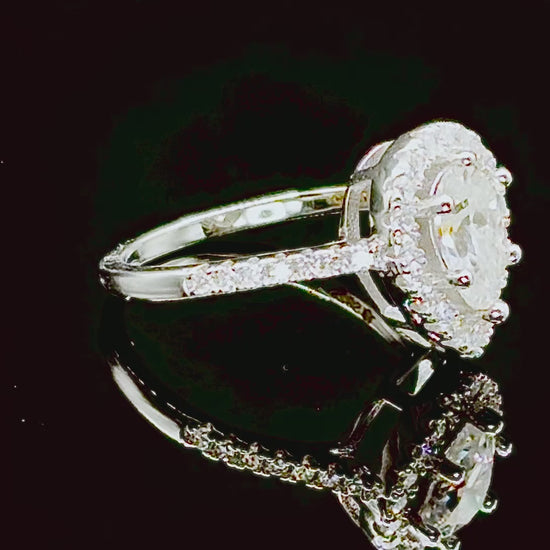 Design: Pear-shaped halo style with accent stones along the band
