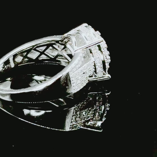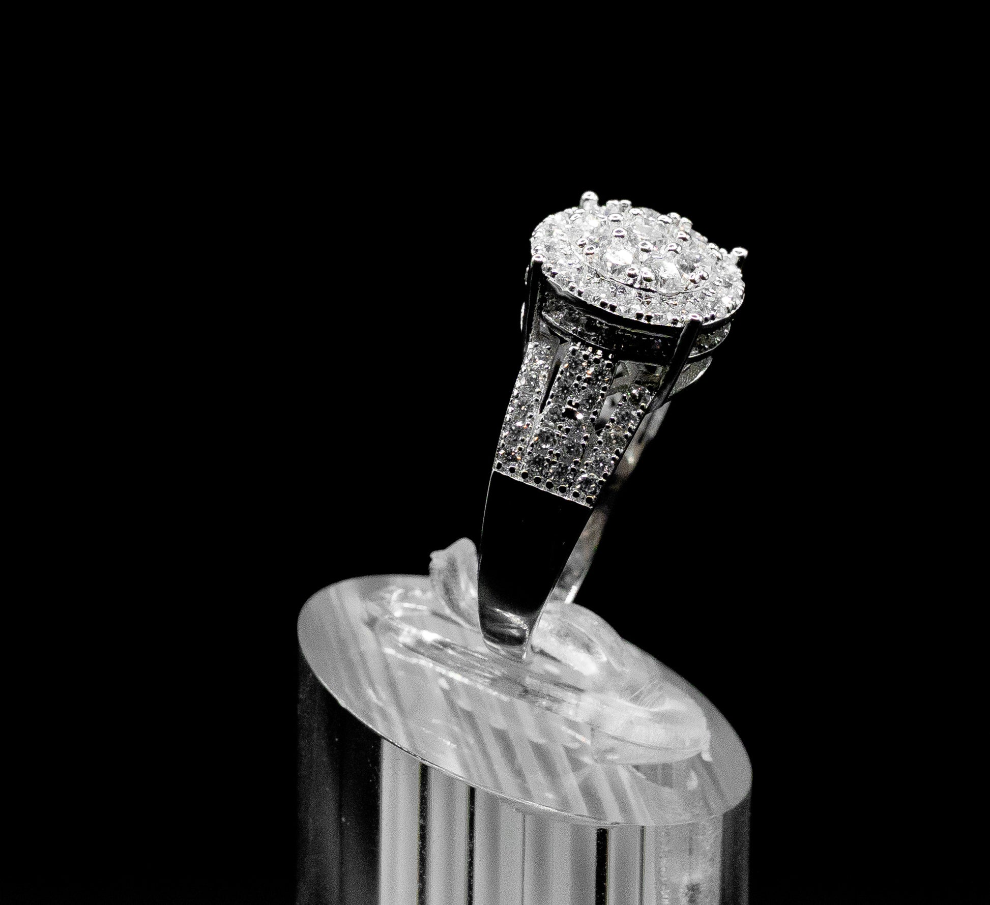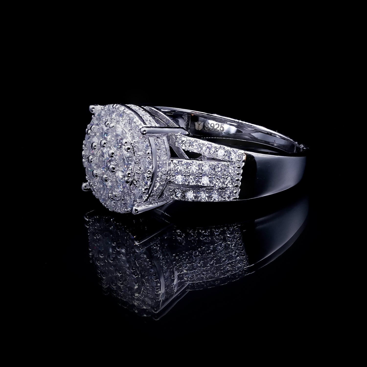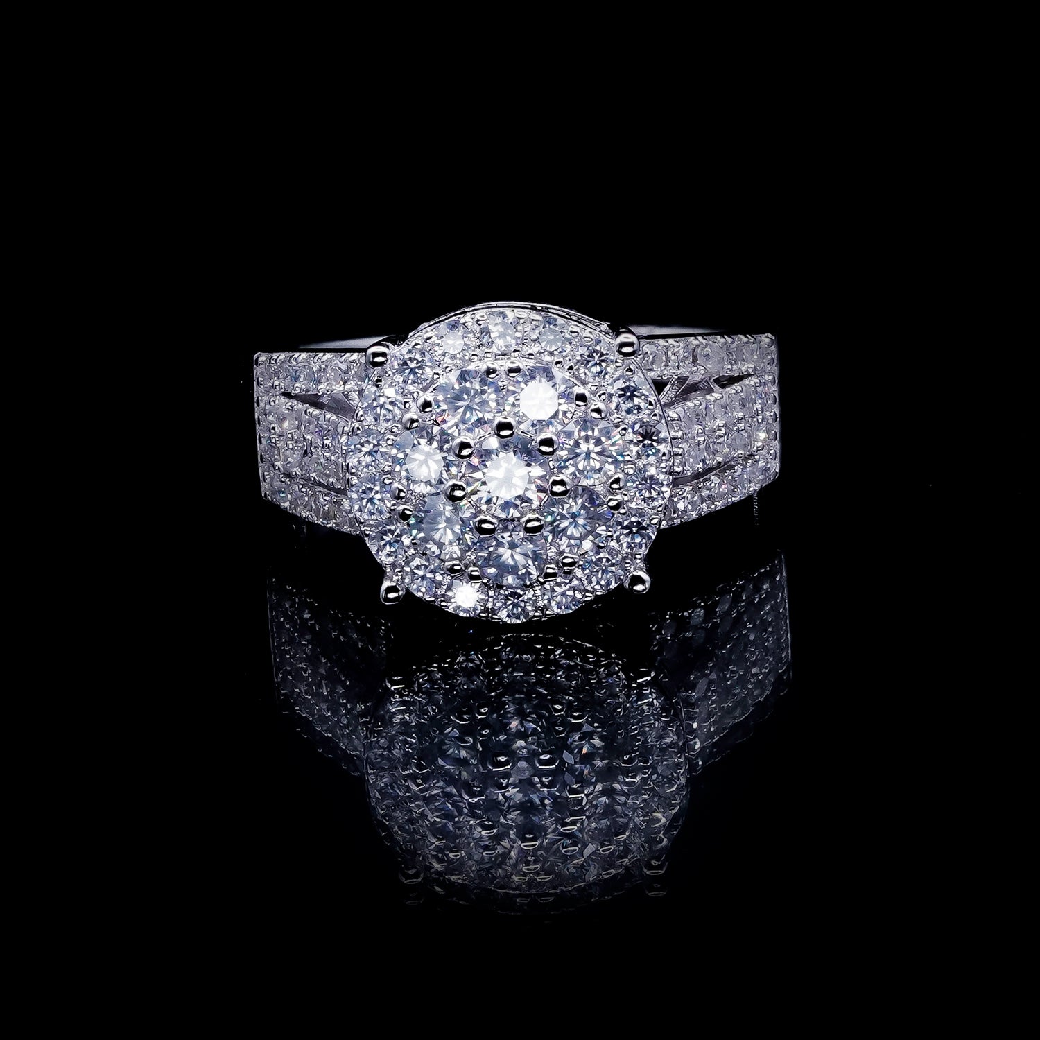 Crafted in 925 sterling silver (4.00 Gram), the split-shank band is embellished with shimmering moissanite stones, enhancing its luxury appeal while offering durability and elegance. The clustered setting creates the illusion of a larger diamond centerpiece, making it a perfect choice for women who love bold sparkle with a refined touch.